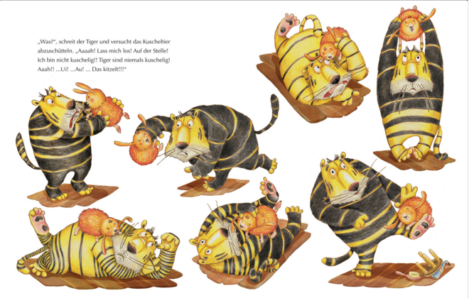 Doch eines Tages klopft es an seiner Tür. Draußen steht – ein Kuscheltier. Es zieht beim Tiger ein und geht nicht wieder weg, da kann er sich auf dem Boden wälzen und mit den Beinen strampeln, soviel er will. Das Kuscheltier erteilt ungerührt Unterricht in Sachen Freundlichkeit, Rücksichtnahme und Höflichkeit. Und all das soll der Tiger auch noch üben! Kann er der Großen Kuscheligkeit widerstehen?