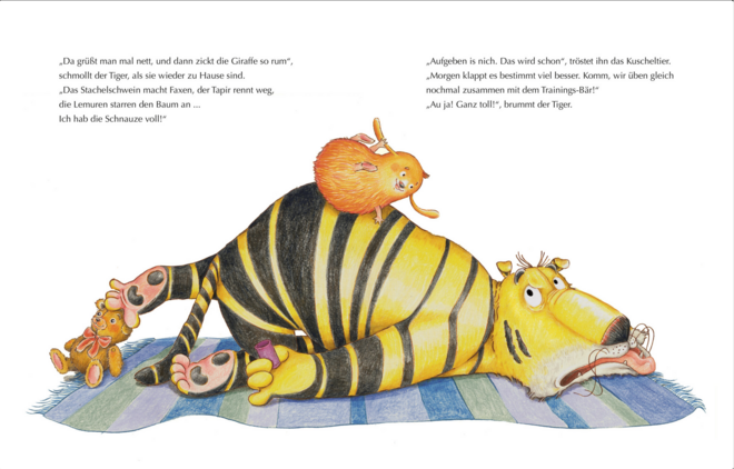 Der Tiger leidet an der Großen Unkuscheligkeit, immer meckert er nur herum. Die anderen Tiere gehen in Deckung, wenn er um die Ecke biegt, leider nicht immer rechtzeitig. Dann erklärt er ihnen lauthals alles, was ihm nicht passt!